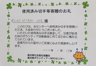 1月27日、皆様から頂いた使用済切手3,482枚を、高知県社会福祉協議会(福祉交流プラザ)へ寄付しました。