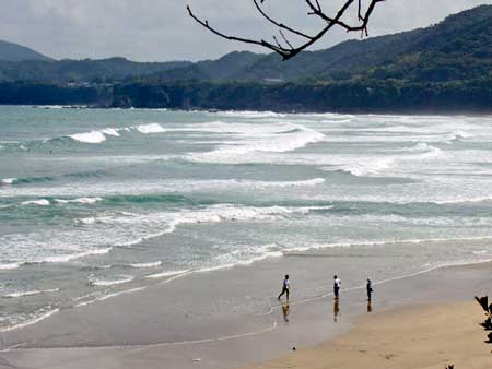☆ サーフィンで有名な「大岐の浜」 遠くにある台風のためか大きな波があり、波乗りが出来ないので残念そうに海を眺めています。 |