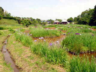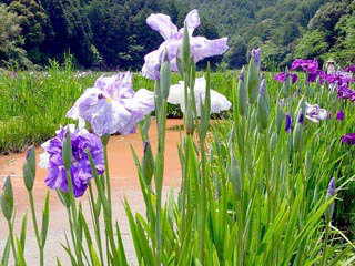 ハナショウブ、カキツバタの花に囲まれたトンボ誘致池