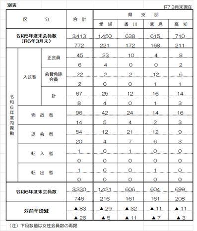 (6) 令和6年度末会員数は別表のとおりで令和5年度末と比較して11名の減となっています。