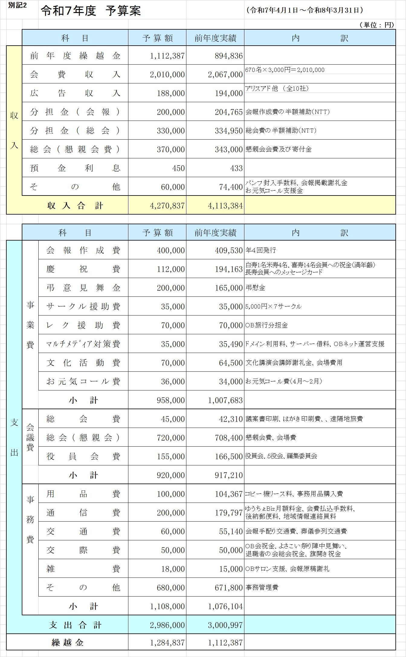 続いて、令和7年度の事業計画(案)『別記1』、同予算(案)『別記2』を提案し、原案どおり承認されました。